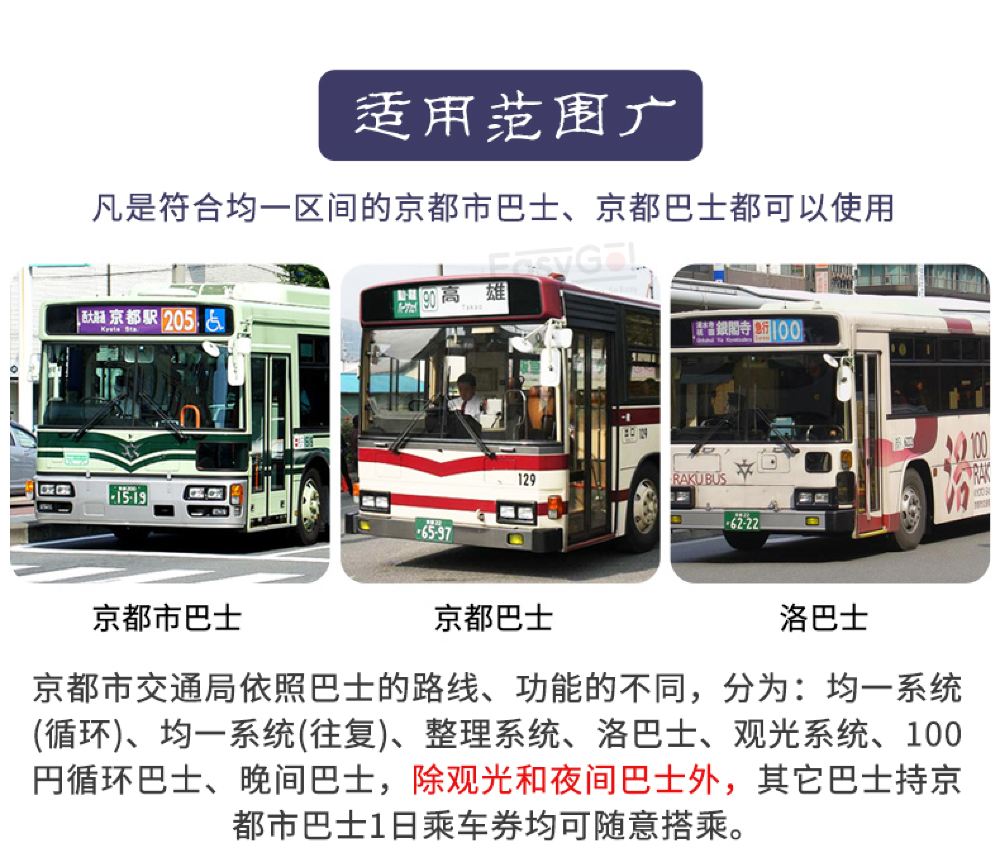 产品信息 京都市巴士1日乘车券 巴士 是一座城的移动缩影 是旅行路上的温暖停靠 持有乘车券 巴士坐个遍 购买理由 景点直达 畅游市区 清水寺 二条城 金阁寺 八坂神社 京都市区的景点为数众多 京都巴士直达门口 还在犹豫什么 最省